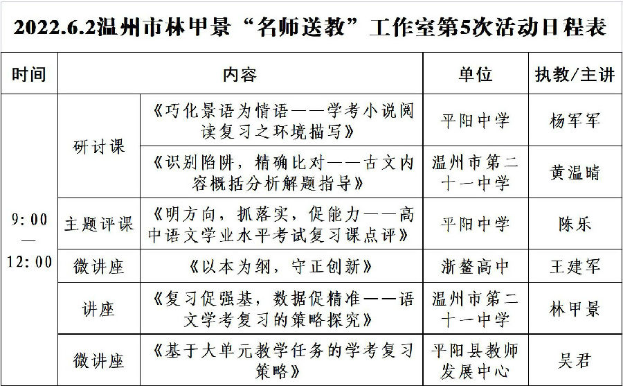 关于举行温州市林甲景“名师送教”工作室第5次活动的通知