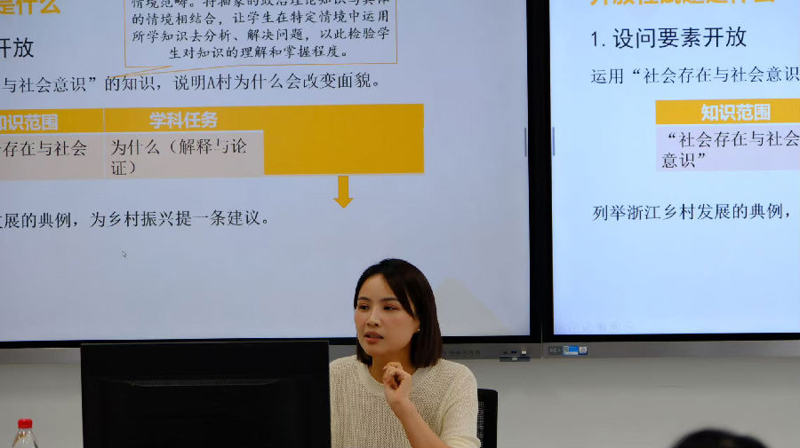 针对当前课改热点“开放性试题”的教学应对问题,本次活动还开展了专题研究活动。17日上午,进行开放性试题解题指导课的课堂教学展示和课例分析。工作室学员、文成中学赵若伊老师以2024年6月浙江高考真题为例,以学生解析命题特征、读取试题信息、评价同伴答案、现场答题演练四部曲开展解题指导。温州市第八高级中学祝天和老师以“交叉、互动、发散法”解密《政治与法治》模块开放性试题的解题逻辑。浙江省教坛新秀、浙派名师培养对象、市“孵化研修”学科指导师团队成员、苍南中学叶兰留老师以《政治与法治》第九课“全面推进依法治国的基本要求”为学科内容载体,以“建设清朗网络空间”为话题,构建了建网篇、净网篇、警网篇三个环节,对建议类、撰写演讲稿类开放性试题进行了解题指导。