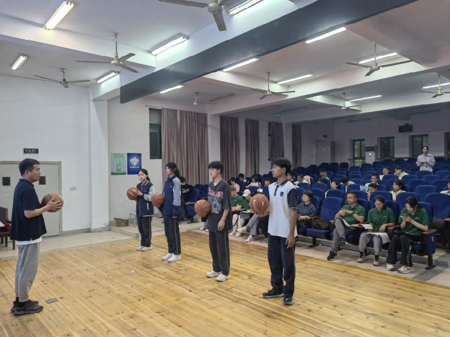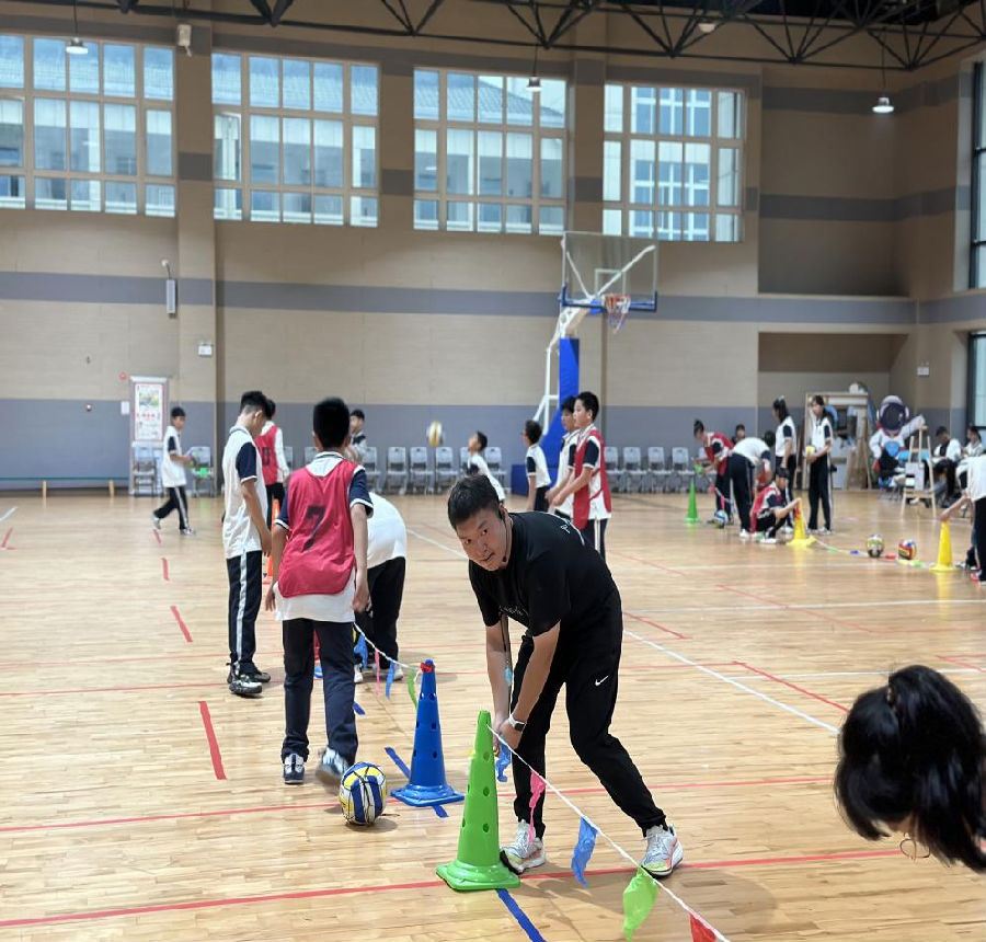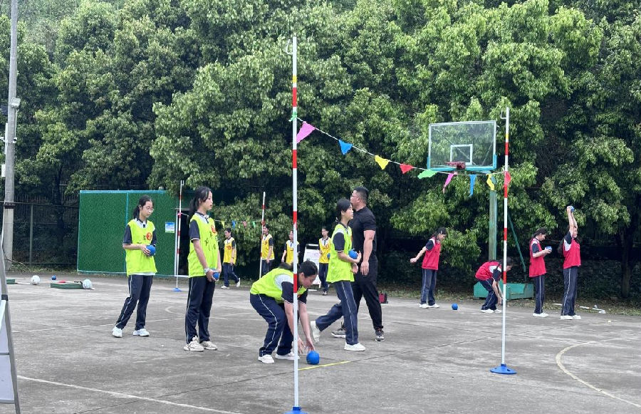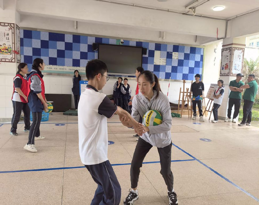 在桥墩中学的会场中,来自瑞安市阁巷中学的曾羽老师执教了九年级的《篮球半场往返运球投篮的练习方法》,来自温州二中、赵蕾名师工作室的包茜茜老师执教了《肩肘倒立的练习方法2:前滚翻成直角坐+肩肘倒立》,来自温州二十五中学的高程雅老师执教了《排球:正面双手垫球的练习方法2》,来自苍南县桥墩第一中学的周垂钢老师执教了七年级《障碍跑练习方法1:连续跨越障碍物》,来自平阳县昆阳镇第三中学、赵蕾名师工作室的蒋成伟老师执教了八年级《双手头上前掷实心球练习方法2:快速过一定高度的练习》。