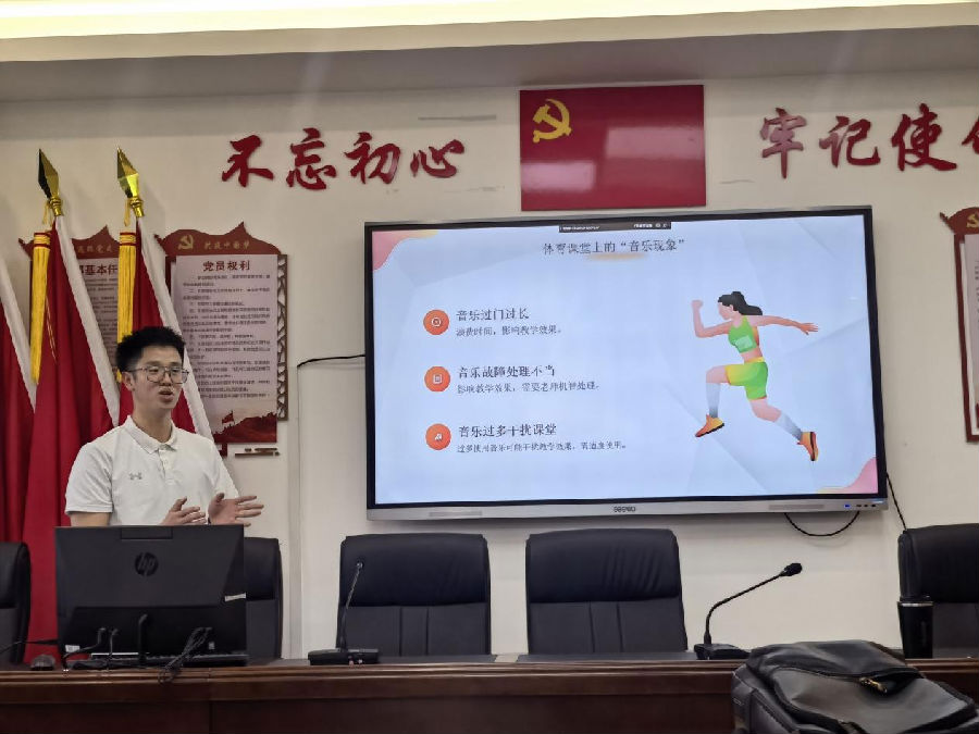 在第一天的课例展示之后,曾荣“名师送教”工作室的成员进行了拆书说书活动。第一位分享者是来自龙湾区外国语小学的胡坯坯老师,他与大家一同探讨的是于素梅老师编撰的《上课的门道》一书。作为音痴的他,跟大家分享的是音乐元素如何运用于体育课堂教学,他认为课堂中的音乐选择需把握好度,好的音乐可以积极尝试提高学生的积极性,但广泛的使用或者使用不适合的音乐反而会对课堂起到一定的干扰作用。