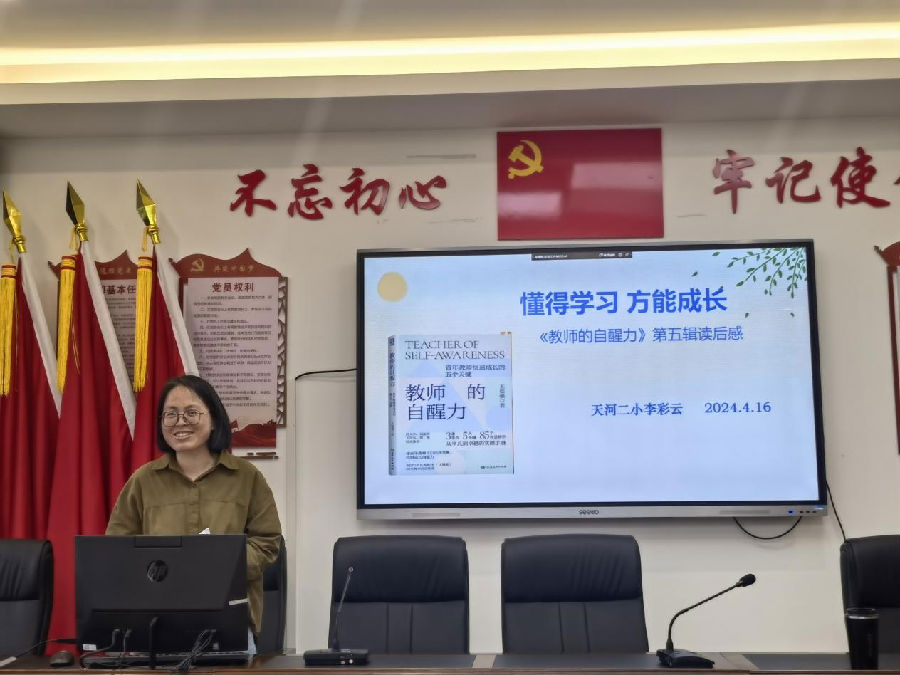 第三位分享者是来自天河二小的李彩云老师,她分享了《教师的自醒力》第五辑里“懂得学习,方能成长”这一章节,通过把小事做好、建立良好的人际关系和学会用欣赏的眼光看待别人三个方面来阐述,她强调了教师要注重细节、重视人际关系,以及发现和欣赏别人的优点和长处。通过深入浅出地阐述这些观点,并结合自身的工作实例,让与会老师更好地理解并应用这些理念,从而提升自身的教育素养和影响力。
