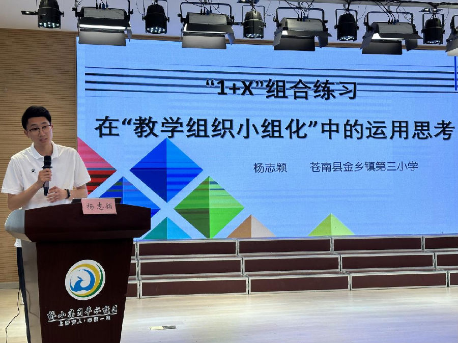 首先来自苍南县金乡镇第三小学的杨志颖老师给我们带来的是《“1+X组合练习”在“教学组织小组化”中的运用思考》的交流分享。杨老师从创设的提出、意义、策略及评价四个方面进行阐述,重点提出学生基于自身能力水平,从“技术、体能、运用”三个维度出发,创编适合自己的组合练习方式,提升学习效率,提高创新能力。