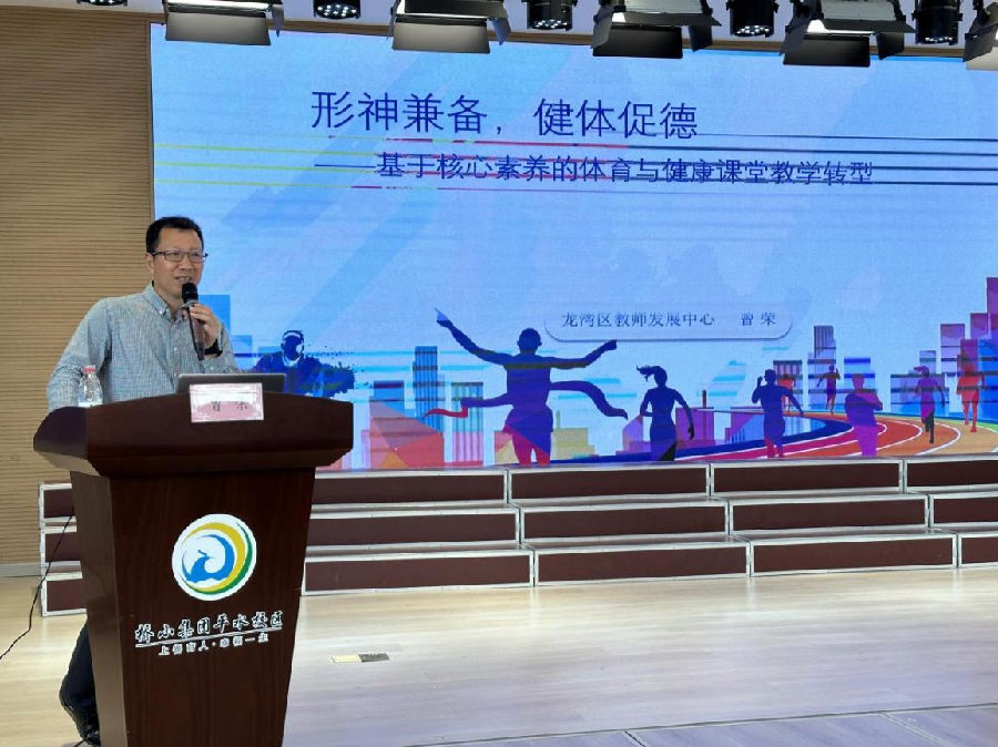 接着,来自龙湾区教师发展中心体育教研员曾荣老师做《形神兼备、健体促德——基于核心素养的体育与健康课堂教学转型》专题讲座,他从“形——四化”、“神——三有”的要求出发,要求体育教师在课堂中回归“健体促德”的体育教学内涵,为教师们的课堂教学确定了目标导向,上“有笑有汗”的体育课堂。